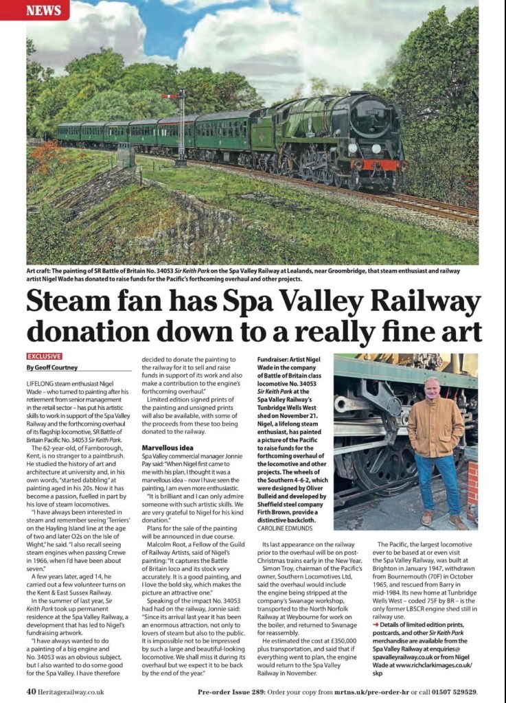 I am really pleased (actually ridiculously excited!) to have my painting of the wonderful steam locomotive, Sir Keith Park featured with an interview in Heritage Railway magazine.