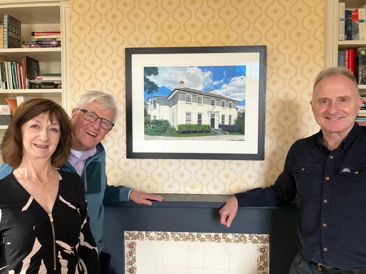 My 60 x 42cm painting of ‘Fetcham House’ is pictured below, together with a photo of Bill and his lovely wife Betty, along with me, at the unveiling in their home yesterday.